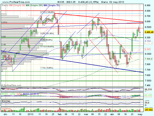 En la sesión de hoy el Ibex nos deja una vela de onda alta que refleja la gran indecisión existente en el mercado, que sigue alcista en el corto plazo, aunque también tenemos que tener en cuenta que se acerca a niveles de resistencia importantes en la zona de los 8.550 – 8.600 puntos, que pueden dar un disgusto. El selectivo sigue dentro de un canal bajista y esta figura no se anulara, mientras no veamos precios sobre los 8.600 puntos, por encima de los 8.600 puntos, un ataque a los máximos es mas que probable.