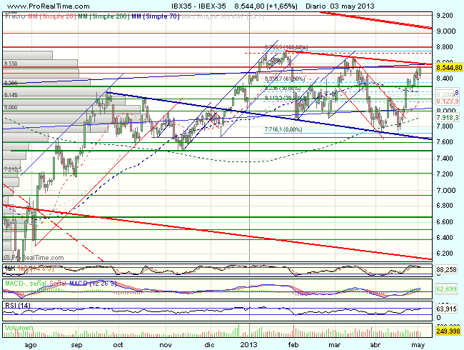 En consecuencia, la tendencia del Ibex 35 en el corto plazo es alcista, con primeros objetivos en los 8.600 – 8.675 puntos.