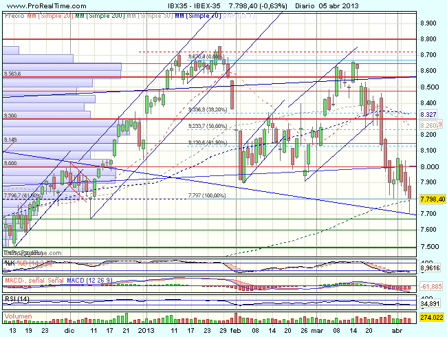 La perdida de los 7.700 puntos, implicaría también la perdida de la media de 200 sesiones, y empeoraría notablemente el aspecto técnico de medio plazo, abriendo el camino para mayores caídas hacia los 7.500 puntos.