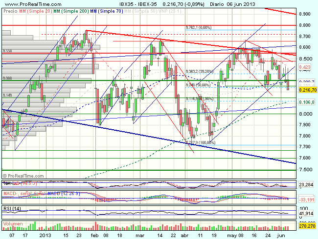 El Ibex 35 iniciaba la sesión de hoy bajo presión compradora, aunque aparecieron ventas con fuerza nuevamente en el nivel de los 8.400 puntos que frenaron las alzas, llevando al índice al rojo y terminaba cerrando con perdidas del 0,89%, en los 8.216,70 puntos, por debajo del 50% de retroceso de todo el impulso alcista previo.