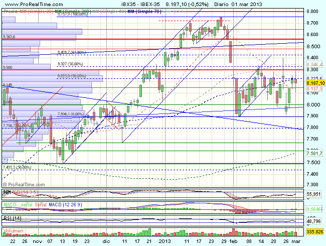 El Ibex 35, se mantenía volátil en la sesión de hoy, incapaz de superar la barrera en los 8.300 puntos, y terminaba cerrando con perdidas del 0,52%, en los 8.187,10 puntos, por debajo del 38,2% de recuperación de toda la caída desde los 8.755 puntos. Jornada volátil, que cierra otra semana también volátil y en la que el selectivo gana un 1%.