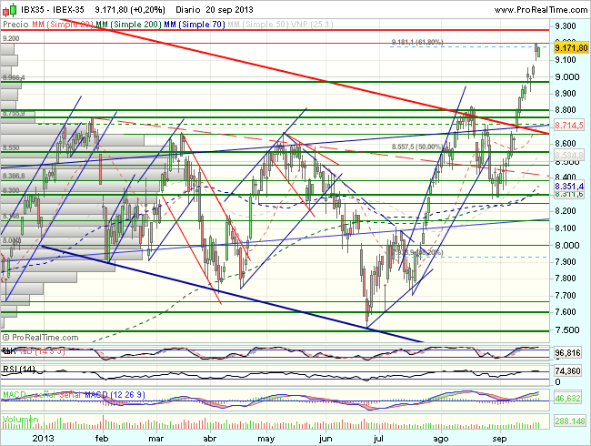 La semana en que entramos, no estará exenta de riesgos, pues el Ibex vuelve a encontrase en niveles de resistencia clave, en el entorno de los 9.175 -9.275, como son resistencias de largo plazo y el 61,8% de recuperación de toda la caída previa desde los 11.200, que bien pudieran provocar una consolidación, pero cuya superación constituiría una señal de fortaleza que impulsaría los precios en dirección a los 9.800 puntos.