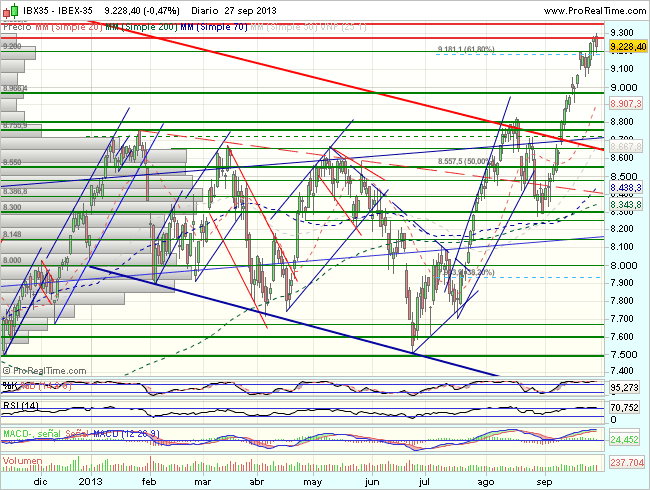 El Ibex 35 se mantenía bajo presión vendedora durante la sesión del viernes, y terminaba cerrando con beneficios del 0,47%, en los 9.228,40 puntos, frenado ante la resistencia relevante de los 9.300 puntos y cerraba con ello una semana alcista, en la que recupera un 0,62%.