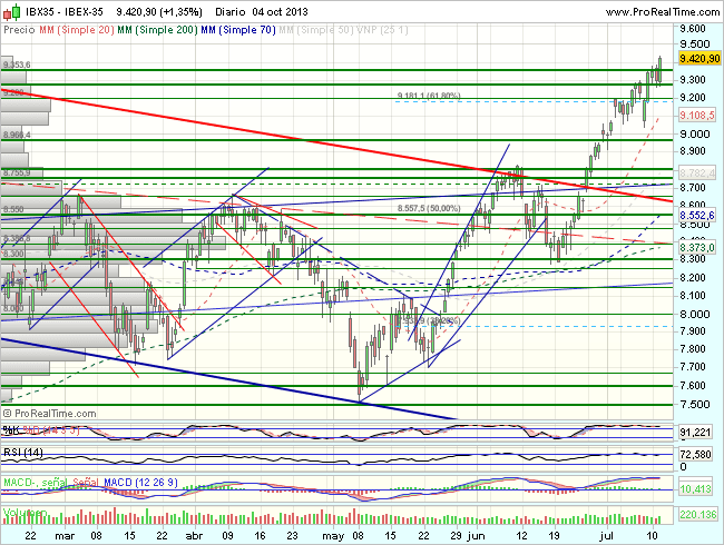 En consecuencia, la tendencia del Ibex 35 en el corto plazo es alcista, con primeros objetivos en los 9.800 – 10.200 puntos.
