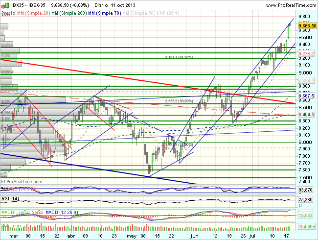Dada la fuerte sobrecompra, no seria extraño asistir a jornadas de consolidación, que no pondrán en peligro el sesgo alcista, mientras el Ibex se mantenga sobre los 9.000 puntos y a mayor plazo los 8.250 puntos.