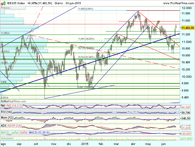 Por lo que se refiere al aspecto técnico del Ibex, en el medio plazo, tras encontrar soportes en los 6.738 puntos, desarrolla un impulso alcista, hasta los 11.200, que fuerzan una consolidación.