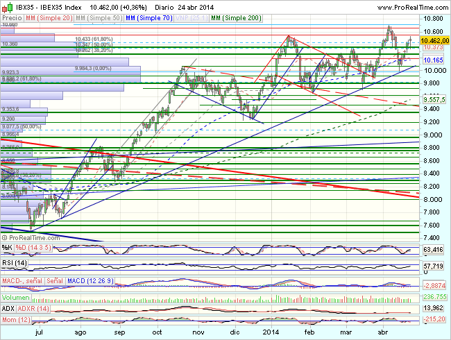 Por lo que se refiere al aspecto técnico del Ibex, en el medio plazo, desarrolla un impulso alcista, hasta los 10.650.
