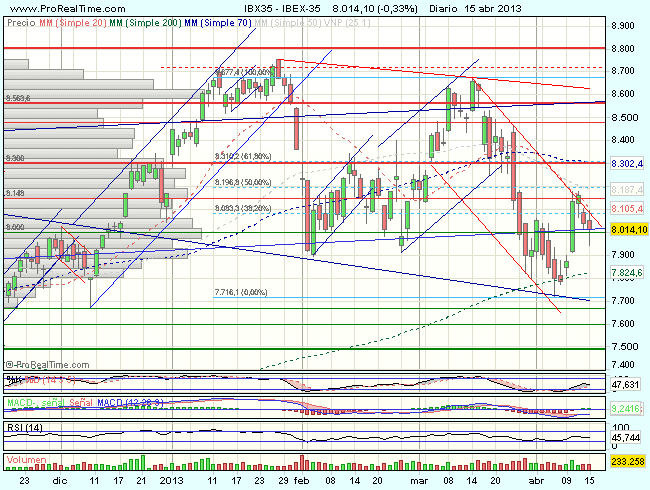 El Ibex 35, se encontraba fuertemente volátil en la sesión de hoy, aunque al final se impusieron las ventas y terminaba cerrando con perdidas del 0,33%, en los 8.014,40 puntos, ligeramente por encima del soporte en los 8.000 puntos.