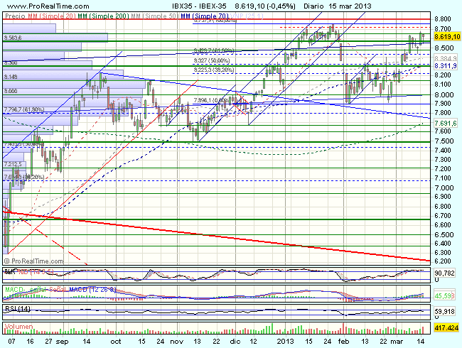 El Ibex nos deja en la sesión de hoy, una vela de martillo con implicaciones alcistas y fuerte incremento de volumen, lo que hace pensar en la continuidad de las alzas,  hacia los máximos de los 8.755 puntos. Sin embargo el Ibex, va perdiendo fuerza a medida que se acerca a la zona de resistencias de los 8.650 – 8.755 puntos, por lo que aunque el sesgo se mantiene alcista, no es descartable antes, algún episodio de consolidación.