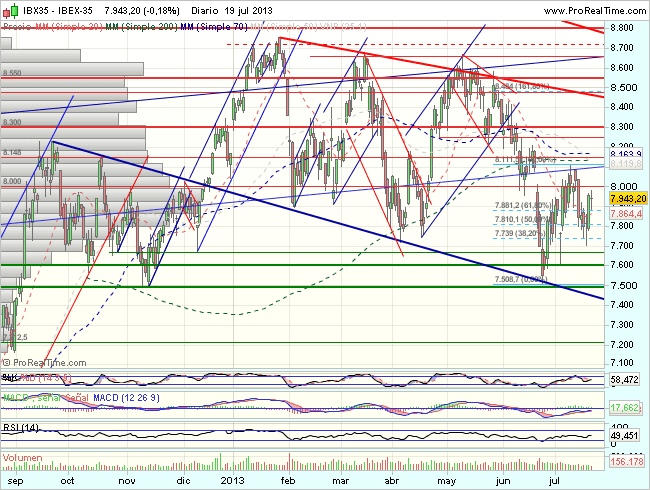 El Ibex 35 iniciaba la sesión del viernes bajo presión vendedora, aunque encontró apoyos en el entorno de los 7.900 puntos, que aminoraron los números rojos y terminaba cerrando con perdidas del 0,18%, en los 7.943,20 puntos, por encima del nivel del 61,8% de recuperación del impulso bajista previo.
