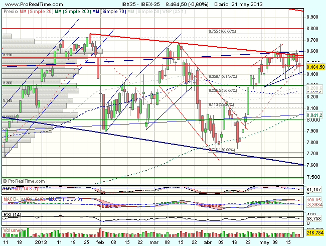 El Ibex 35 se mantenía bajo presión vendedora en la sesión de hoy, aunque encontró algún apoyo en el soporte de los 8.400 puntos aminorando las perdidas y terminaba cerrando con perdidas del 0,60%, en los 8.464,50 puntos, por debajo del soporte en los 8.475 puntos.