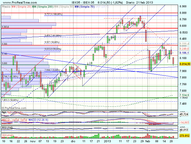 El Ibex 35, se encontraba bajo fuerte presión vendedora en la sesión de hoy, y terminaba cerrando con perdidas del 1,82%, en los 8.014,50 puntos, manteniéndose sobre el soporte de los 8.000 puntos, que llego a perforar durante la sesión.