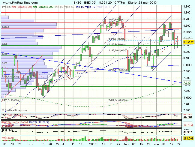 El Ibex nos deja en la sesión de hoy, una vela de peonza que refleja indecisión y aunque el sesgo de fondo permanece alcista, estamos en un momento lateral de consolidación por lo que no hay que bajar la guardia, por lo menos hasta que lo de Chipre no se aclare.