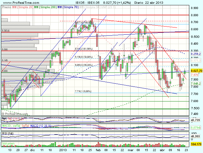 En la sesión de hoy, el Ibex vuelve a dejarnos una vela de indecisión, aunque de mejor aspecto que las anteriores, confirma la superación de la media de 200 sesiones y supera la resistencia en los 8.000 puntos, mejorando su aspecto técnico de corto plazo. Sin embargo será aun necesario, que supere los 8.179 puntos, máximos del impulso previo, para confirmar una mejora sustancial y continuidad de las alzas en dirección a los 8.500 puntos.