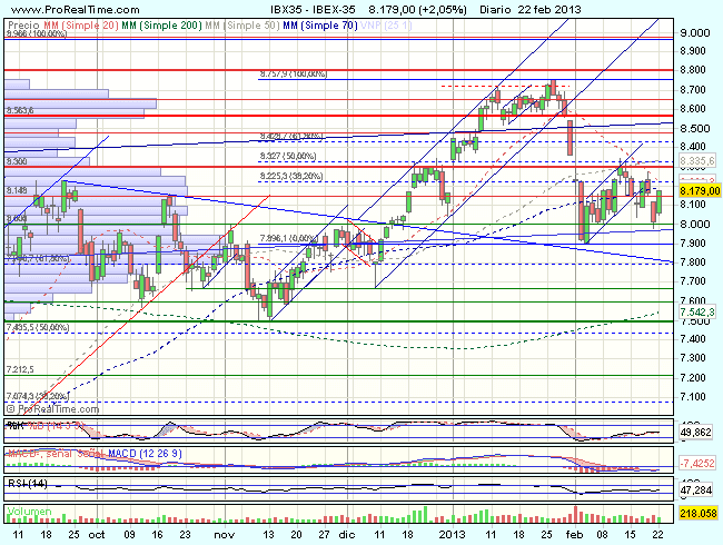 En consecuencia, la tendencia del Ibex 35 en el corto plazo es alcista, con primeros objetivos en los 8.300 – 8.362 euros.