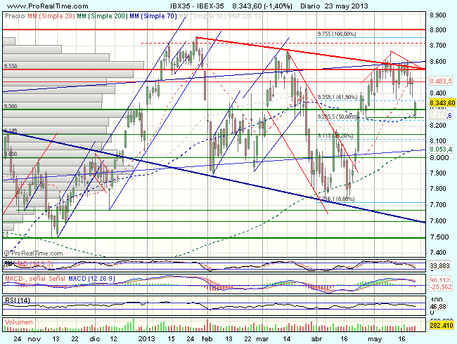 El Ibex 35 se iniciaba la sesión bajo fuerte presión vendedora, abriendo con amplio gap bajista e incremento de volumen, aunque encontró algún apoyo en el soporte de los 8.250 puntos, que aminoraban las perdidas y terminaba cerrando con perdidas del 1,40%, en los 8.343,50 puntos, por encima del soporte en los 8.300 puntos.