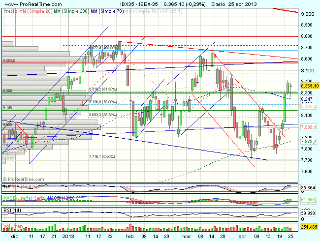 En consecuencia, la tendencia del Ibex 35 en el corto plazo es alcista, con primeros objetivos en los 8.500  – 8.675 puntos.