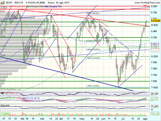 En consecuencia, la tendencia del Ibex 35 en el corto plazo es alcista, con probables objetivos en los 8.670 – 8.800 puntos.