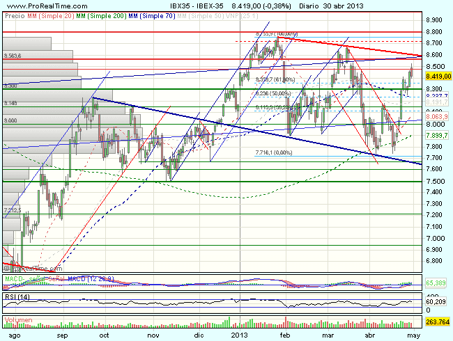 Sesión de consolidación,  que no cambia demasiado el aspecto técnico del Ibex que sigue alcista en el corto plazo, aunque también tenemos que tener en cuenta que se acerca a niveles de resistencia importantes y que con mas perspectiva, el selectivo se mueve dentro de un canal bajista y esta figura no se anulara, mientras no veamos precios sobre los 8.600 puntos, mientras tanto conviene ser cautos, que la prudencia nunca esta de más.