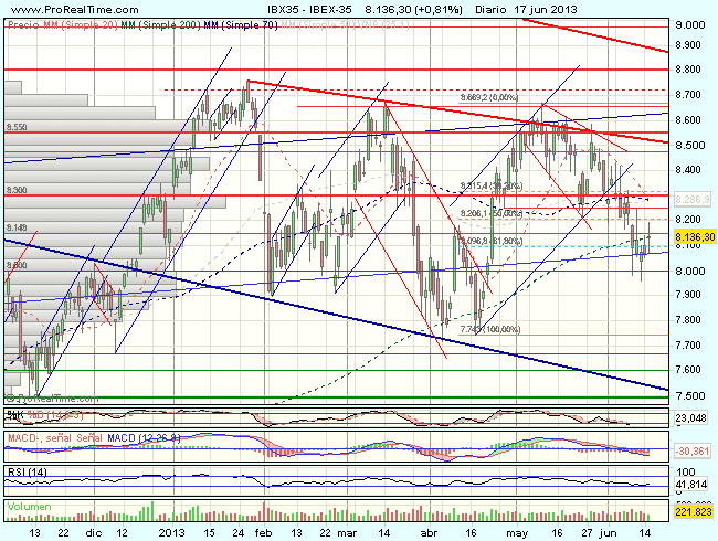 El Ibex 35 se mantenía bajo presión compradora la sesión de hoy, aunque aparecieron con fuerza las ventas en el entorno de los 8.200 puntos que aminoraron las ganancias, y terminaba cerrando con beneficios del 0,81%, en los 8.136,30 puntos, por debajo de la resistencia clave en los 8.150 puntos, que llego a perforar durante la sesión.