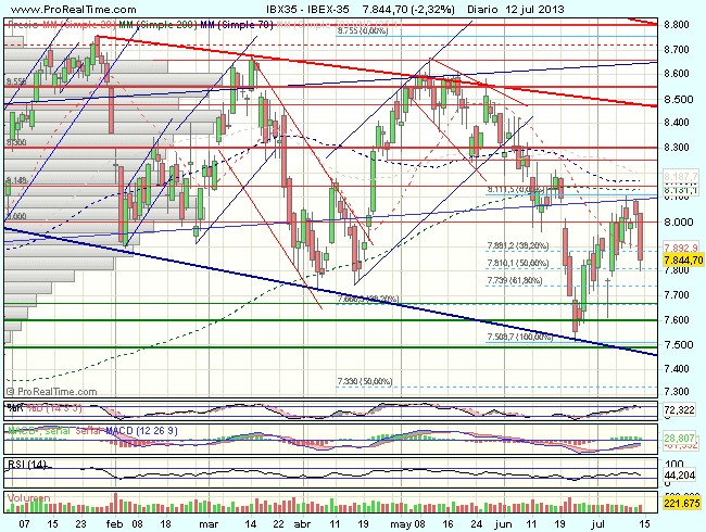 Aunque puedan producirse rebotes, no confiaremos en una mejoría técnica, mientras los precios no superen claramente los 8.200 puntos. La perdida de los 7.500 puntos, por el contrario, empeoraría notablemente el aspecto del Ibex y daría continuidad al impulso bajista, en dirección a los 7.200 puntos.