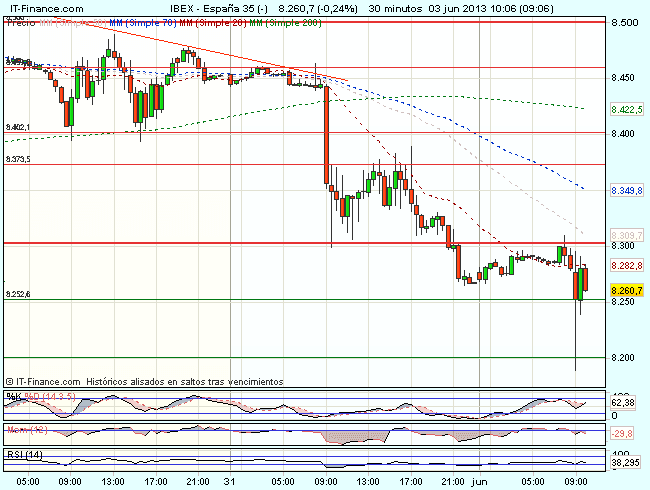 En consecuencia para la sesión de hoy, el aspecto técnico del Ibex es bajista, y mientras se mantenga cotizando bajo los 8.460 puntos, es posible la continuidad de la corrección, con objetivos los 8.200 – 8.150 puntos.