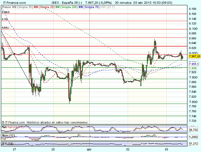 En consecuencia para la sesión de hoy, el aspecto técnico del Ibex es bajista, aunque mientras se mantenga cotizando sobre los 7.800 puntos, hay posibilidades de continuidad de la recuperación, con objetivos los 8.030 – 8.100 puntos.