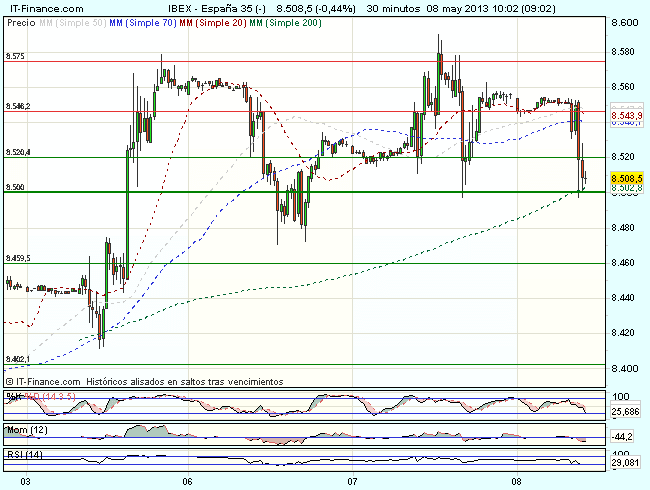 El Ibex 35 ha iniciado la sesión bajo ligera presión vendedora, en un rango estrecho entre la resistencia de los 8.550 puntos y el soporte de los 8.000, y cotiza durante la sesión con perdidas del 0,42%, hasta los 8.508,50 puntos, aun por encima del nivel de los 8.500 puntos.
