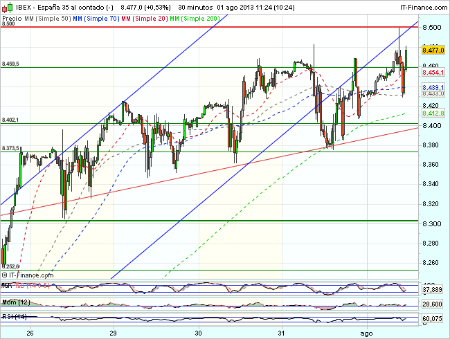 El Ibex 35 se encuentra volátil en la sesión de hoy, aunque frenado ante el la resistencia relevante de los 8.500 puntos, y cotiza durante la sesión, con beneficios del 0,51%, hasta los 8.476,50 puntos.