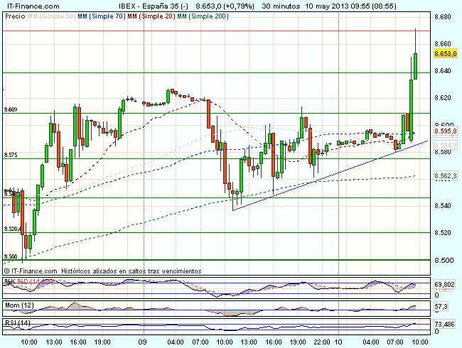 El Ibex 35 ha iniciado la sesión bajo presión compradora, superando la resistencia clave de los 8.600 puntos, y cotiza durante la sesión con beneficios del 1,11%, hasta los 8.667,50 puntos, atacando la resistencia en los 8.670 puntos.
