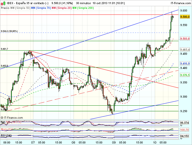 El Ibex 35 se encuentra bajo presión compradora en la sesión de hoy, tras apoyarse en el nivel de los 9.250 puntos, y cotiza durante la jornada, con beneficios del 1,54% hasta los 9.584,50 puntos.