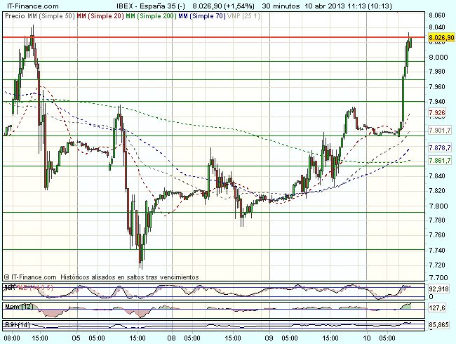 El Ibex 35 ha iniciado la sesión bajo presión compradora, y cotiza durante la sesión con beneficios del 1,87%, hasta los 8.019,50 puntos, superando el nivel psicológico de los 8.000 puntos.