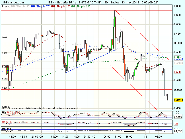 El Ibex 35 ha iniciado la sesión bajo presión vendedora, nuevamente frenado ante la resistencia clave de los 8.600 puntos, y cotiza durante la sesión con perdidas del 0,80%, hasta los 8.476,50 puntos, amenazando el soporte de los 8.500 puntos.