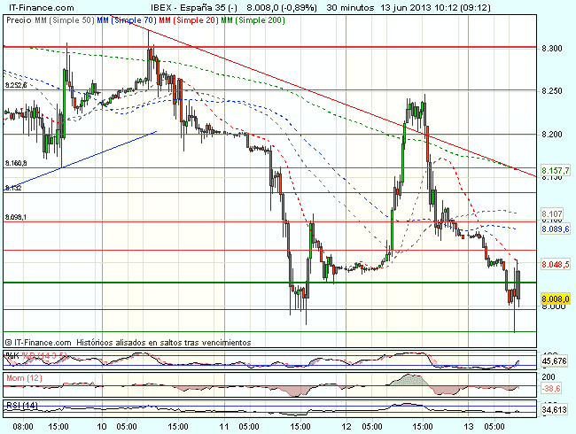 El Ibex 35 ha iniciado la sesión bajo presión vendedora, aunque aparecen algunas compras ante el soporte de los 8.000 puntos donde intenta estabilizarse, y cotiza durante la sesión, con perdidas del 1,46%, hasta los 8.005,50 puntos.