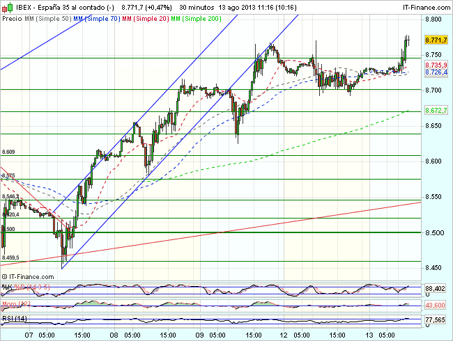 LONE__El Ibex 35 se encuentra bajo presión compradora en la sesión de hoy, superando la resistencia de los 8.750 puntos, muy cerca ya del techo del rango lateral que lo limita durante el año y cotiza con beneficios del 0,58%, hasta los 8.768,50 puntos.