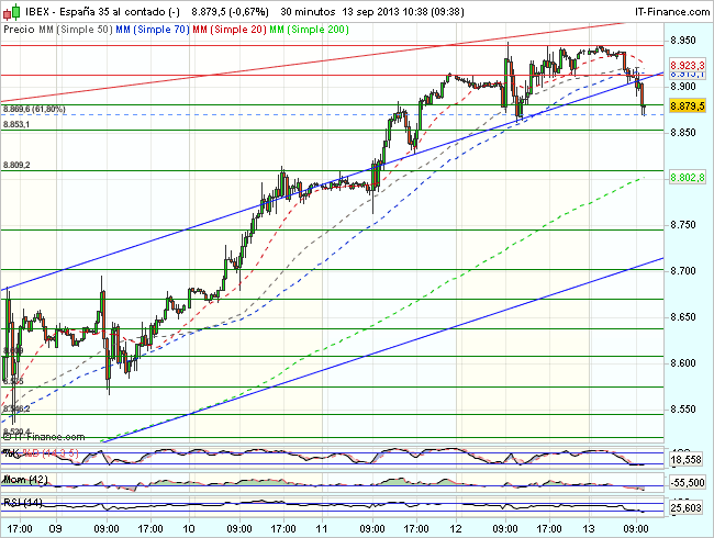 La perdida de los 8.700 puntos, empeoraría notablemente el aspecto técnico y abriría nuevos objetivos de caída en los 8.575 y 8.500 puntos.