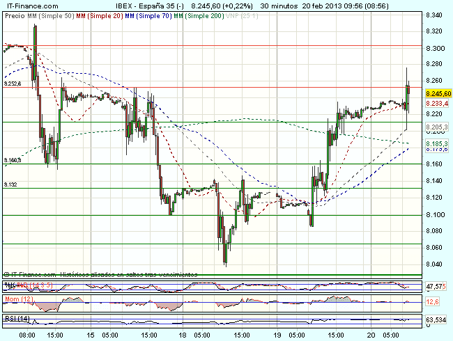 Por encima de los 8.250 puntos, el aspecto técnico del Ibex mejoraría y podríamos ver más alzas, con objetivos en los 8.300 – 8.345 puntos.