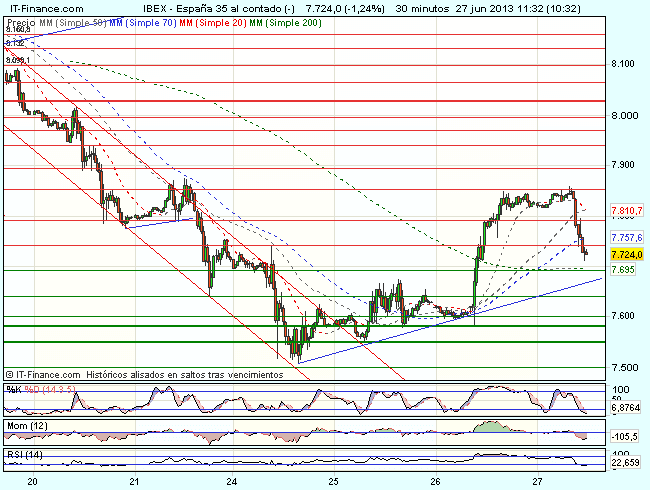 El Ibex 35 se encuentra bajo presión vendedora en la sesión de hoy frenado ante la resistencia en los 7.850 puntos, donde aprietan las ventas, y cotiza durante la sesión, con perdidas del 1,17%, hasta los 7.732,50 puntos, por debajo del soporte en los 7.750 puntos.