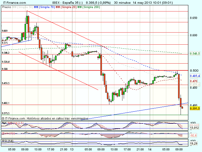 El Ibex 35 ha iniciado la sesión bajo presión vendedora, frenado ante la resistencia de los 8.500 puntos, y cotiza durante la sesión con perdidas del 0,93%, hasta los 8.379,50 puntos, ya por debajo del nivel de los 8.400 puntos.