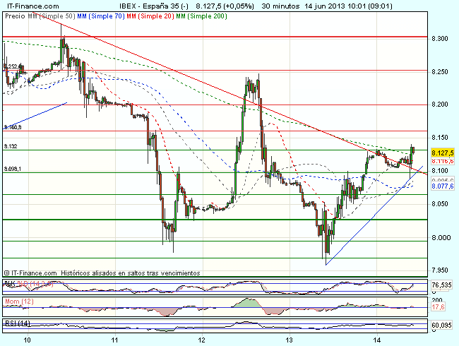 El Ibex 35 ha iniciado la sesión bajo presión compradora, en lo que parece un mero rebote técnico ante el soporte de los 8.000 puntos donde intenta estabilizarse, y cotiza durante la sesión, con beneficios del 0,74%, hasta los 8.131,50 puntos.