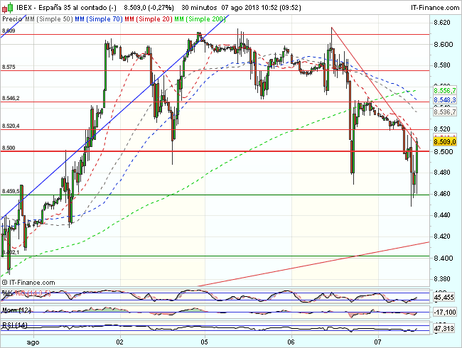 LONE__El Ibex 35 se encuentra bajo presión vendedora en la sesión de hoy, frenado ante la resistencia de los 8.550 puntos,  y cotiza con perdidas del 0,33%, hasta los 8.500,50 puntos.