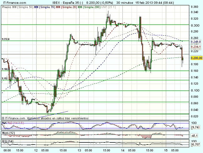 El Ibex 35 ha iniciado la sesión bajo presión vendedora, perforando el nivel de los 8.200 puntos, y cotiza durante la sesión, con perdidas del 0,70%, hasta los 8.189,50 puntos, aun por encima de los mínimos relativos de ayer.