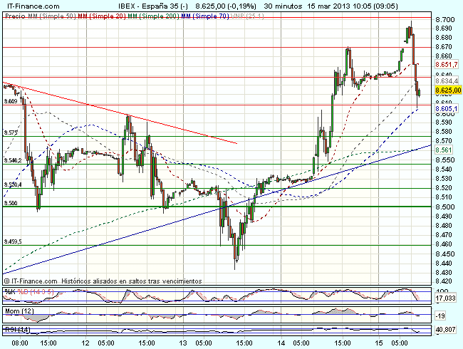 En consecuencia para la sesión de hoy, el aspecto técnico del Ibex es bajista, aunque mientras se mantenga cotizando sobre los 8.550 puntos, hay posibilidades de continuidad de la recuperación, con objetivos los 8.640 – 8.750 puntos.