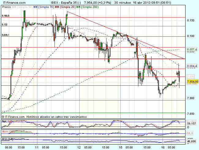El Ibex 35 ha iniciado la sesión bajo presión vendedora y cotiza durante la sesión con perdidas del 0,76%, hasta los 7.953,30 puntos, ya por debajo del soporte en los 8.000 puntos.