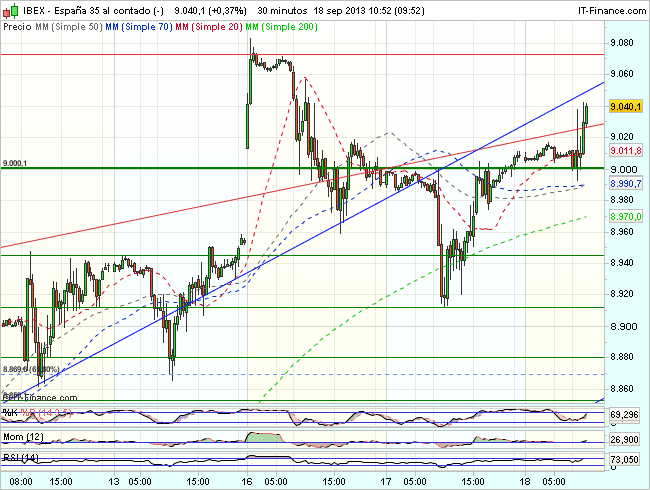 El Ibex 35 se encuentra bajo presión compradora en la sesión de hoy, aunque no exento de volatilidad a vueltas con el soporte de los 9.000 puntos, y cotiza durante la jornada, con beneficios del 0,48% hasta los 9.033,50 puntos.