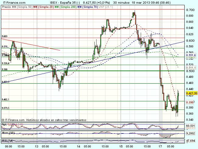El Ibex 35 ha iniciado la sesión bajo fuerte presión vendedora, tras las noticias sobre el corralito financiero en Chipre y cotiza durante la sesión con perdidas del 2,27%, hasta los 8.243,50 puntos, aunque parece encontrar apoyo en los 8.350 puntos, donde aparecen las compras.