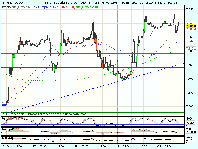 El Ibex 35 se encuentra volátil en la sesión de hoy, entre los 7.935 y los 7.850 puntos y cotiza durante la sesión, prácticamente plano con perdidas del 0,05%, hasta los 7.903,50 puntos.