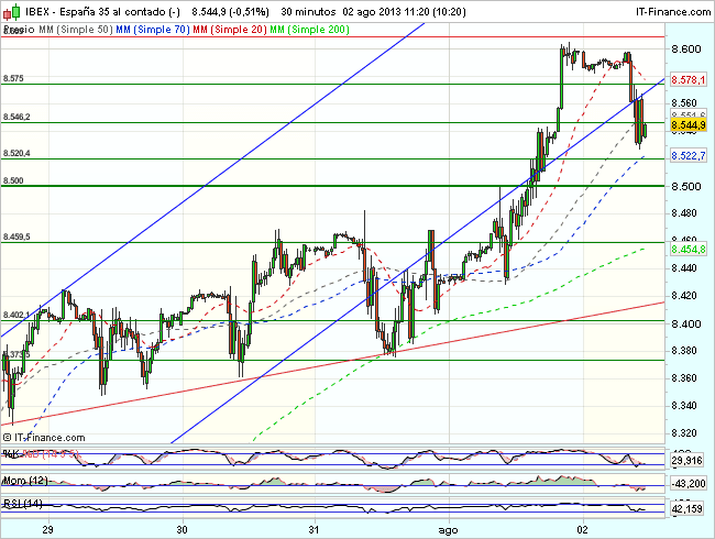 En consecuencia para la sesión de hoy, el aspecto técnico del Ibex es volátil, aunque mientras se mantenga cotizando sobre los 8.450 puntos, es posible la continuidad de la recuperación en dirección a los  8.600 – 8.650 puntos.