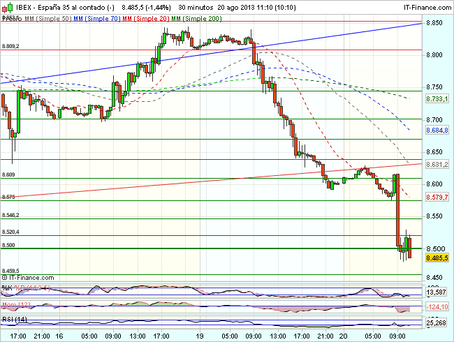 Por lo que se refiere a los indicadores técnicos del Ibex 35 para la sesión de hoy, los osciladores diarios son bajistas, con estocástico y RSI perforando sus zonas neutras y se observa debilidad de momentum que cruza a negativo. Los intradíaríos por su parte son bajistas, mostrando presión vendedora.