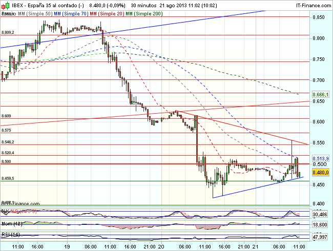 En consecuencia para la sesión de hoy, el aspecto técnico del Ibex es bajista, y mientras se mantenga cotizando bajo los 8.625 puntos, es posible la continuidad de la corrección en dirección a los  8.400 – 8.375 puntos.